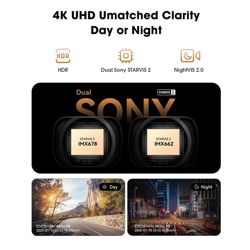 With the front STARVIS 2 IMX678 and rear IMX662 sensors from Sony, the Z60 Pro delivers exceptional clarity with 4K front recording and 1080P rear recording, both featuring HDR for superior image quality in all conditions.