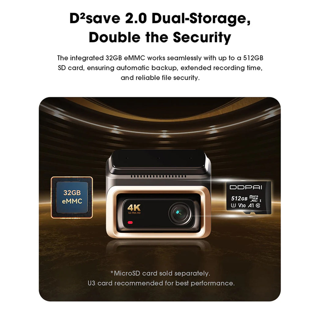 D²save 2.0 Dual-Storage (32GB eMMC+ up to 512GB SD Card) Protection, Worry-free Recording