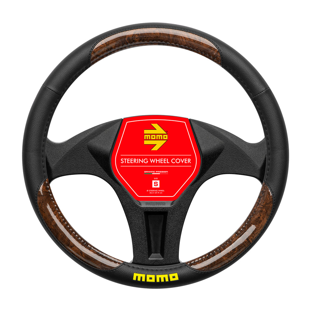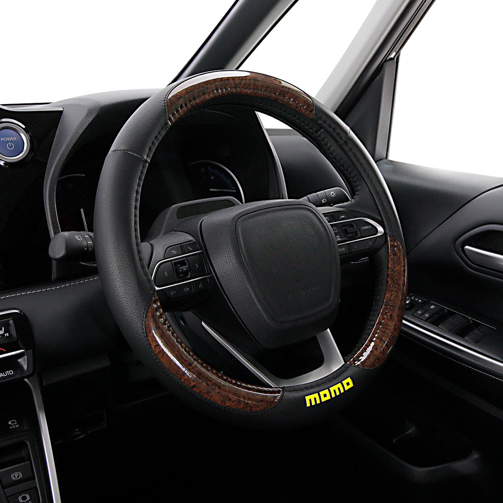 With a combination of black polyurethane and briar look wood, it is finished with black stitching and a white MOMO logo at the bottom centre position.