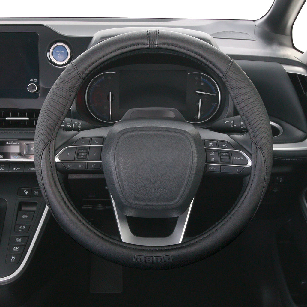 The MOMO Elegant Steering Wheel Cover is produced from the finest soft touch perforated polyurethane material and features a striking Italian design. The MOMO Elegant Steering Wheel Cover features an anti-slip rubber lining to prevent movement and the durable material will ensure it is long lasting. The universal fitment makes the steering wheel cover quick and easy to install. Finished with grey stitching and a white MOMO logo at the bottom centre position, this cover also includes a grey insert at the top of rim. Available in a Medium size only, this steering wheel cover is suitable for steering wheels with a diameter of 380mm (14.96”) to 390mm (15.35”). Sold as a single steering wheel cover.